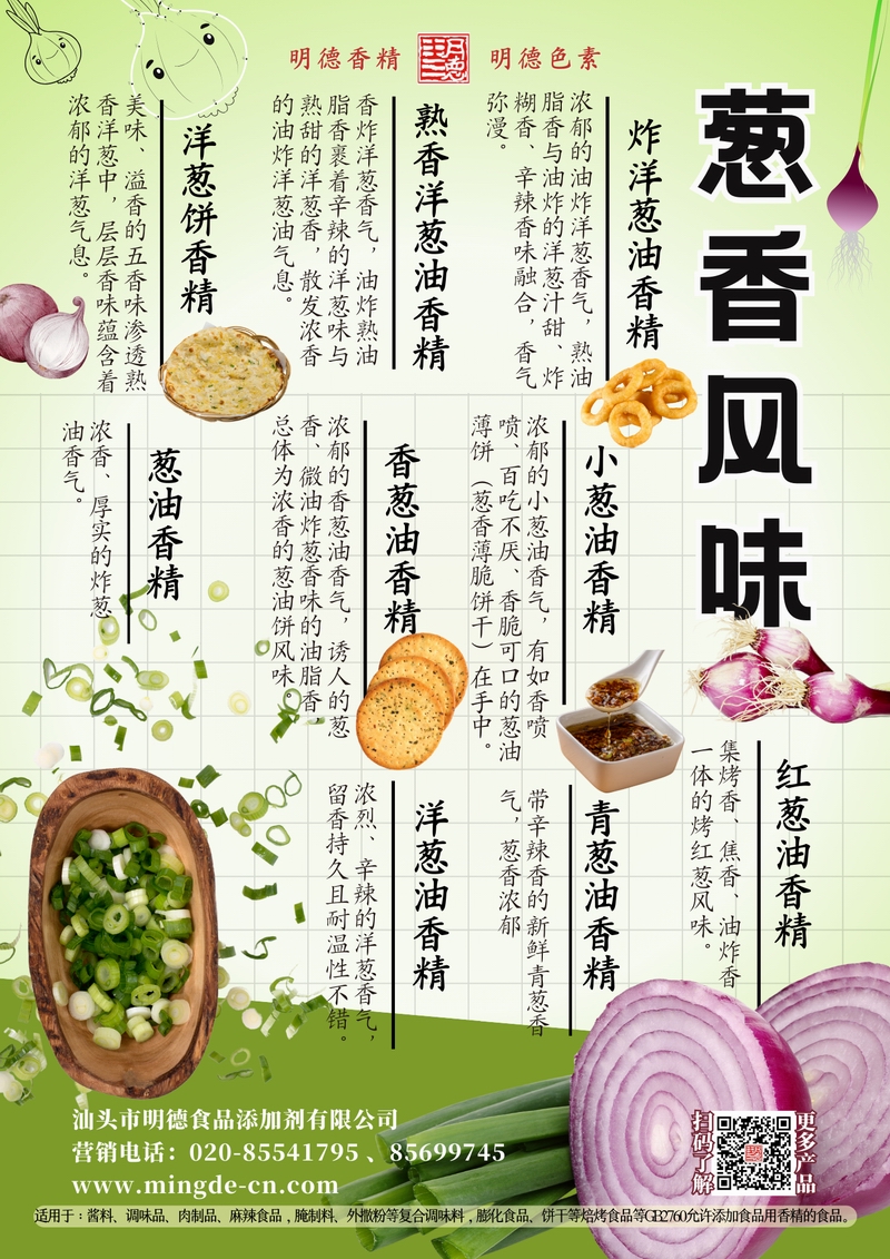 明德蔥香風(fēng)味香精 | 油香蔥韻 覆蓋多場(chǎng)景 汕頭市明德食品添加劑有限公司推出的蔥香風(fēng)味香精系列,涵蓋熟香洋蔥油香精、炸洋蔥油香精、小蔥油香精、香蔥油香精、洋蔥油香精、青蔥油香精、紅蔥油香精、洋蔥餅香精、蔥油香精等多種品類(lèi)。產(chǎn)品呈現真實(shí)蔥香、洋蔥甜香與炸香特征,留香穩定持久,適用于醬料、復合調味、肉制品、焙烤以及休閑食品等B端應用。
